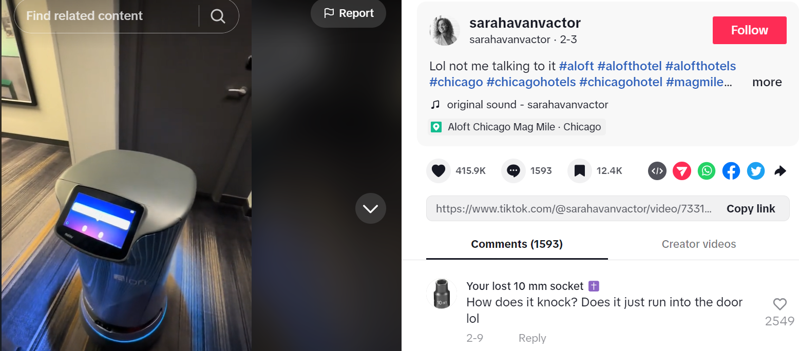 Botlr the robot butler, featured in a TikTok video delivering room service at the Aloft Chicago Mag Mile hotel, has gained viral attention with 4.6 million views. Resembling R2-D2, the Botlr is part of the hotel's service offerings, delivering items like toothbrushes and snacks to guests' rooms within minutes.