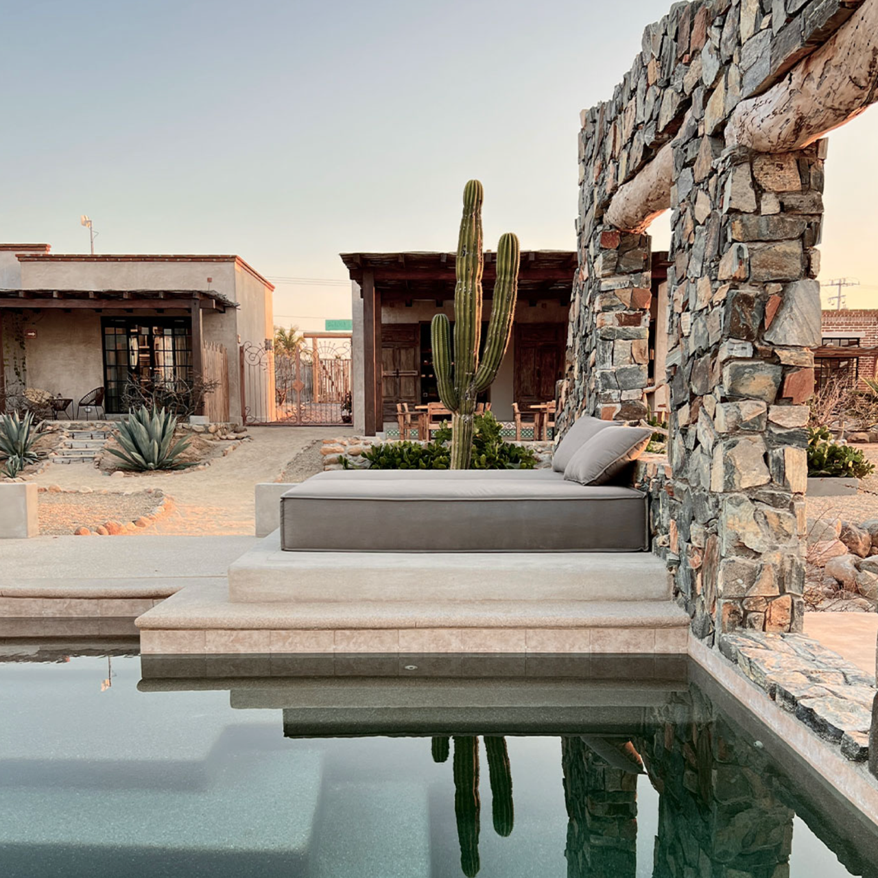From day one, our goal was to create a low-impact sanctuary that coexists with the desert rather than transforming it. Every decision, from the orientation of each room to maximize natural airflow to the selection of solar-powered systems and native landscaping, reflects a deep respect for our Baja surroundings. Our architecture uses local materials like stone and sand-colored finishes to blend seamlessly with the natural palette of the desert of Todos Santos. We did not stop there, reducing toxicants was at the forefront of many intentional decisions we made, from organic cotton sheets in the rooms to a central water filtration system, where guests can drink pure water even when they shower.
